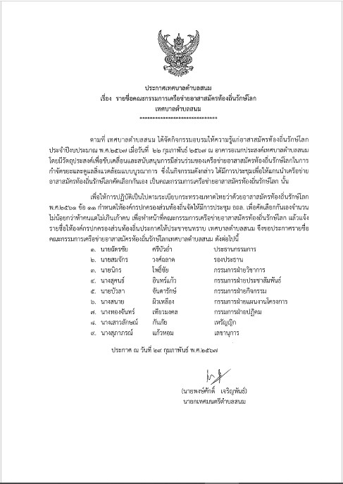 ประกาศเทศบาลตำบลสนม เรื่อง รายชื่อคณะกรรมการเครือข่ายอาสาสมัครท้องถิ่นรักษ์โลกเทศบาลตำบลสนม