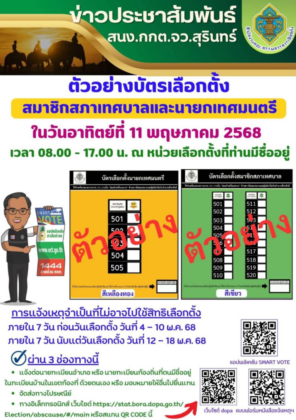 ข่าวประชาสัมพันธ์ สนง.กกต.จว.สุรินทร์ ตัวอย่างบัตรเลือกตั้ง สมาชิกสภาเทศบาลและนายกเทศมนตรี [24 เมษายน 2568]