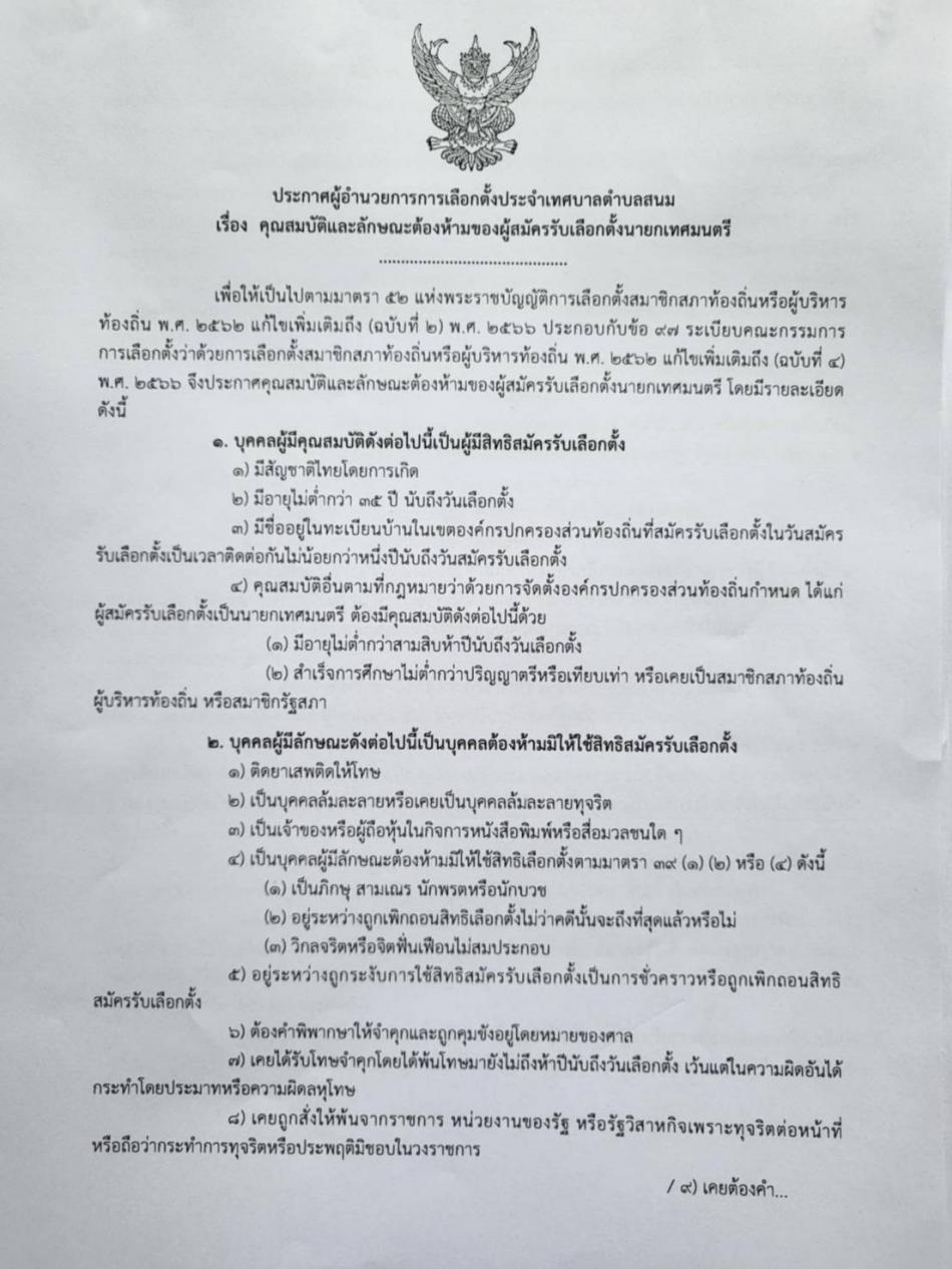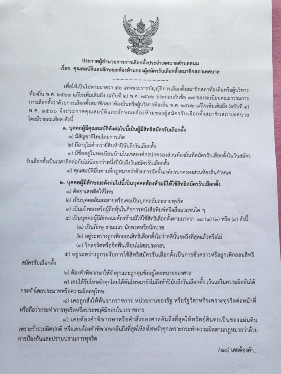 ประกาศคุณสมบัติและลักษณะต้องห้ามของผู้สมัครรับเลือกตั้งสมาชิกสภาเทศบาล [29 มีนาคม 2568]
