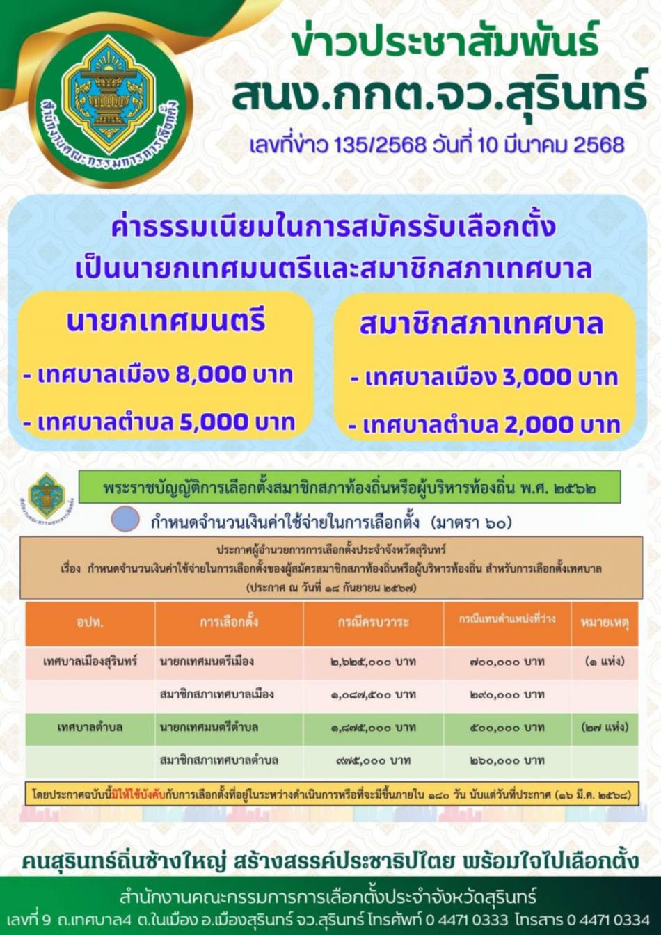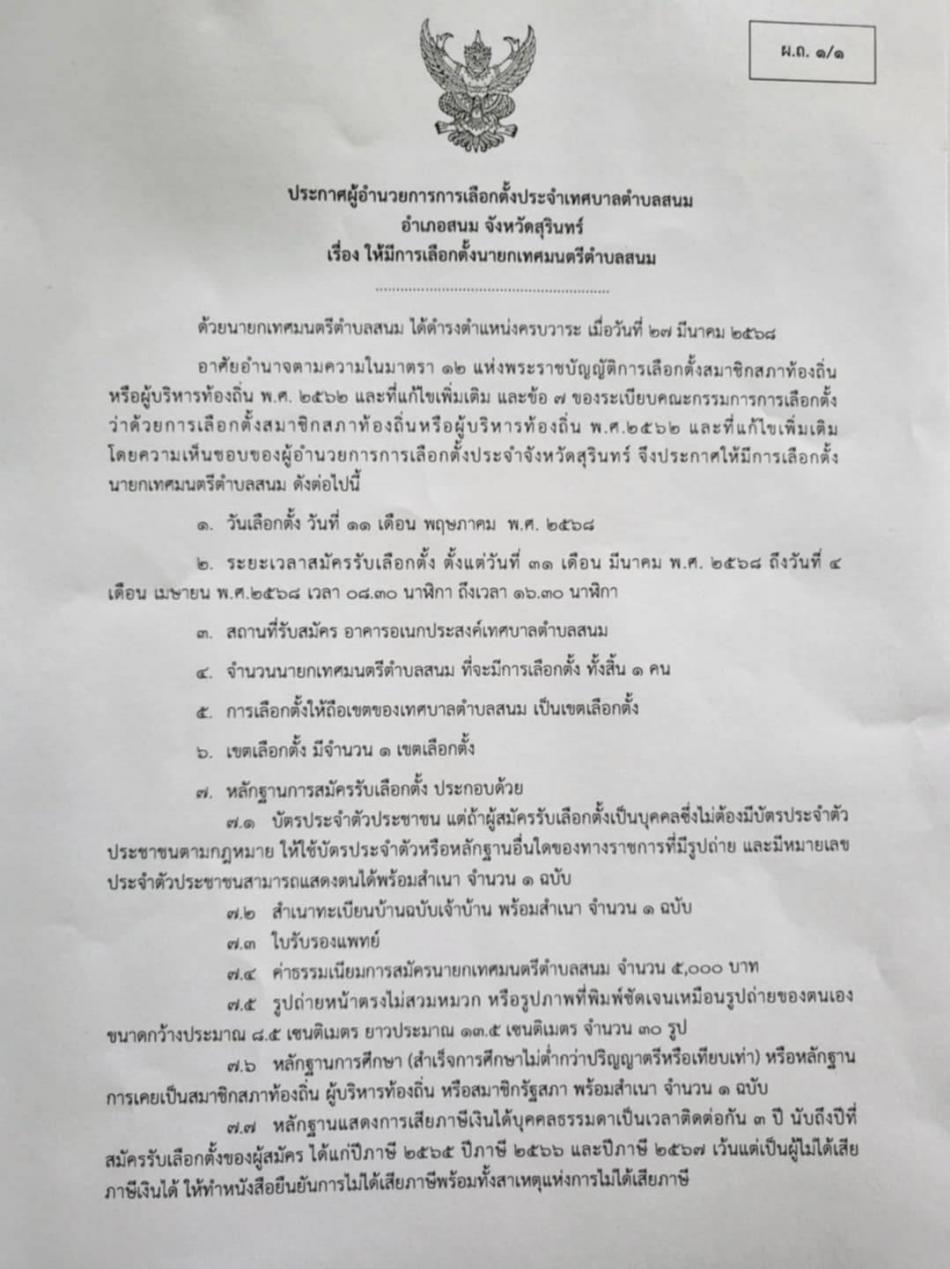 ประกาศผู้อำนวยการการเลือกตั้งประจำเทศบาลตำบลสนม [29 มีนาคม 2568]
