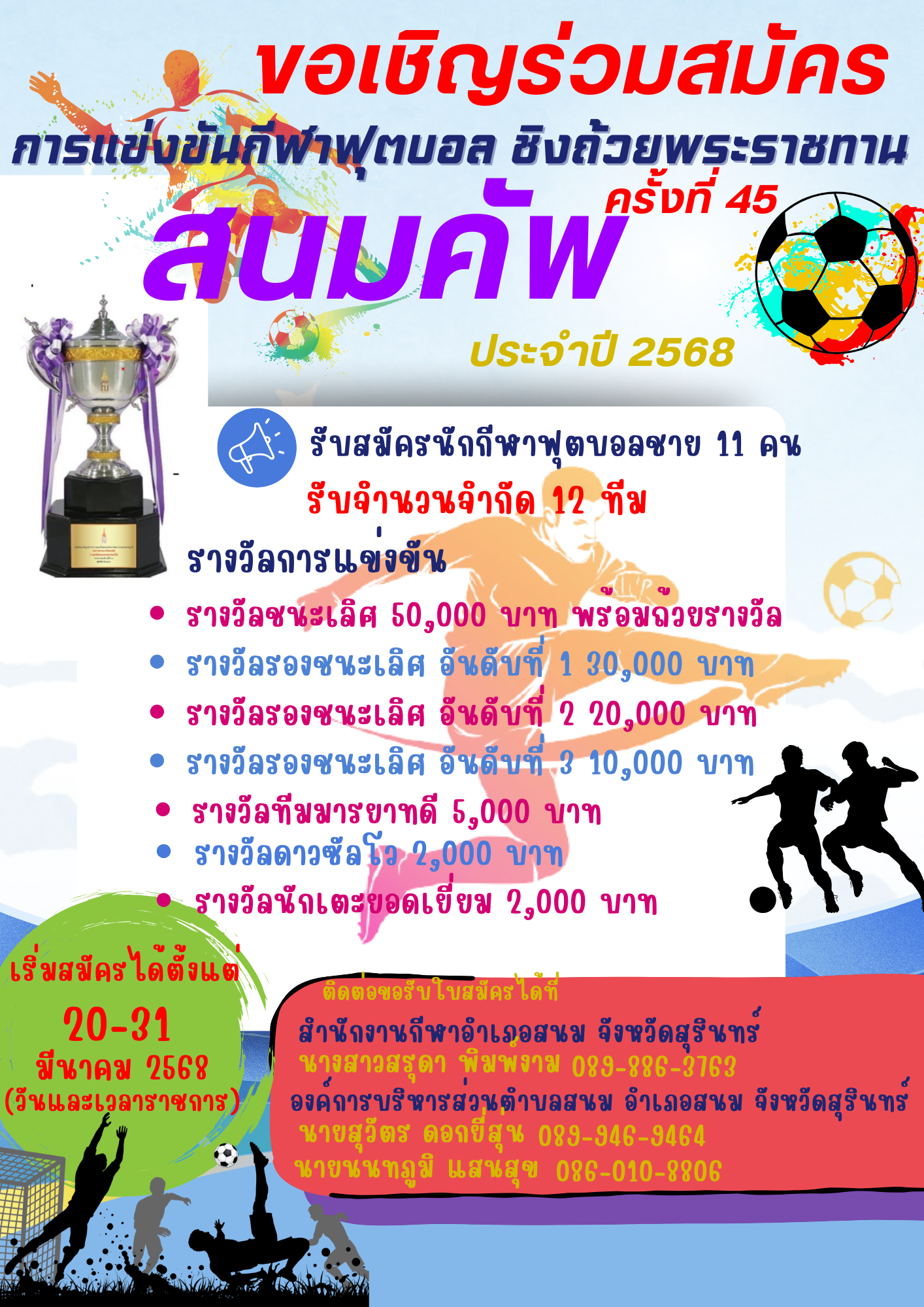ขอเชิญร่วมสมัครฟุตบอล สนมคัพ ชิงถ้วยพระราชทาน ครั้งที่ ๔๕ [20 มีนาคม 2568]