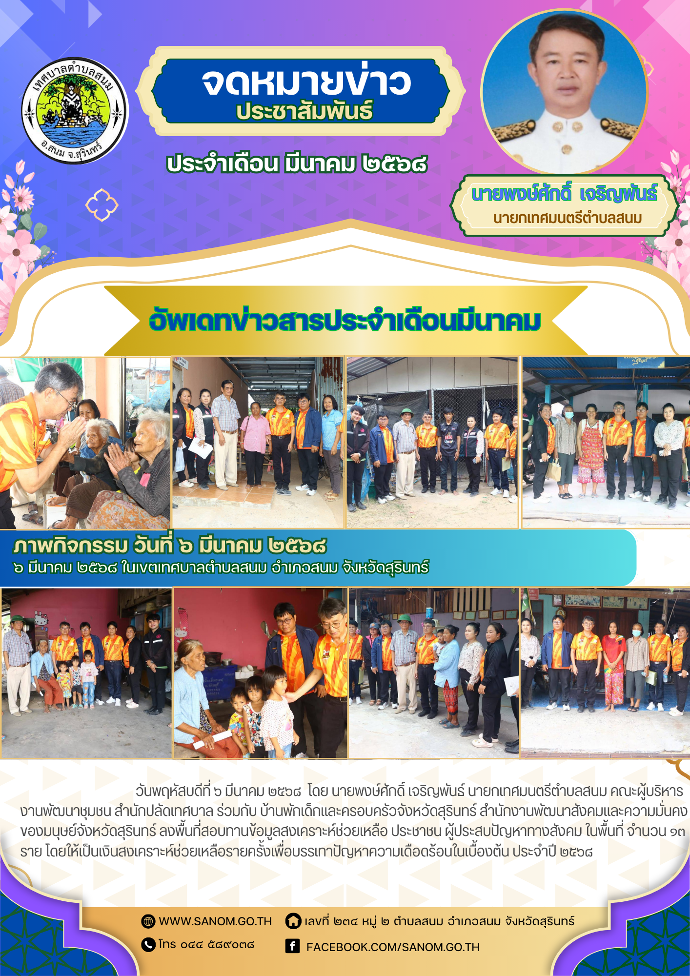 ลงพื้นที่สอบทานข้อมูลสงเคราะห์ช่วยเหลือ ประชาชน ผู้ประสบปัญหาทางสังคม ในพื้นที่เขตเทศบาลตำบลสนม [6 มีนาคม 2568]
